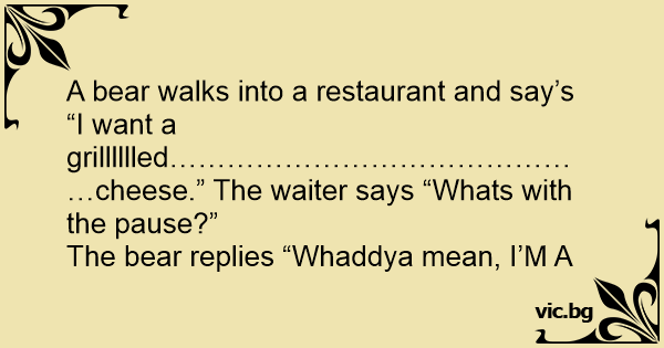A bear walks into a restaurant and say’s “I want a grilllllled………………………………………cheese.” The waiter says “Whats with the pause?”