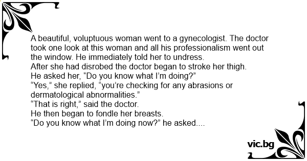 Een mooie, goedgevormde vrouw, ging naar de gynaecoloog. De dokter wierp een blik en vergat waar hij ooit voor had gestudeerd. Hij vroeg haar onmiddellijk om uit te kleden. Nadat zij daar naakt...