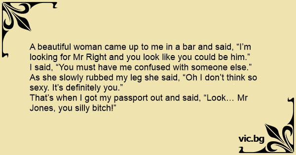 A beautiful woman came up to me in a bar and said, “I’m looking for Mr Right and you look like you could be him.”