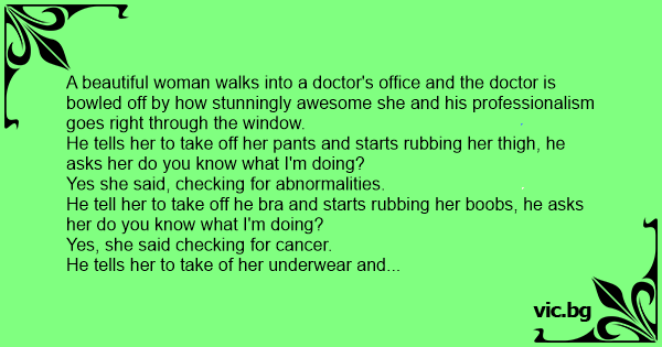 Μία πολύ όμορφη και αισθησιακή γυναίκα, επισκέπτεται έναν γυναικολόγο. Αυτός με το που την βλέπει τα χάνει και ο επαγγελματισμός του βγαίνει από το Παράθυρο. Αμέσως της λέει να γδυθεί και αρχίζει...