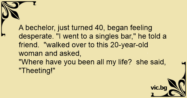 A bechelor, just turned 40, began feeling desperate. "I went to a singles bar," he told a friend. "walked over to this 20-year-old woman and asked,