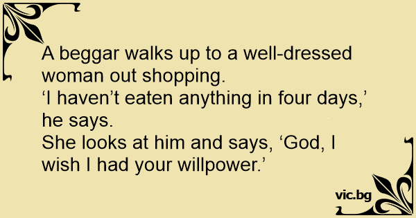 Um mendigo se aproxima de uma senhora cheia de sacolas de compras que ia andando na rua e fala: — Madame, eu estou sem comer há 4 dias. E a madame: — Meu Deus! Eu gostaria de ter sua força de vontade!