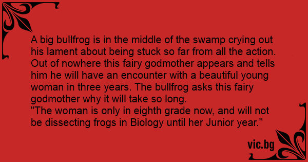 Out of nowhere this fairy godmother appears and tells him he will have an encounter with a beautiful young woman in three years. The bullfrog asks this fairy godmother why it will take so long.