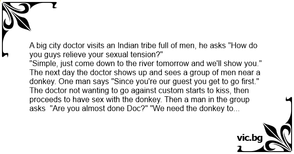 The doctor not wanting to go against custom starts to kiss, then proceeds to have sеx with the donkey. Then a man in the group asks "Are you almost done Doc?" "We need the donkey to cross the river in order to get to the tribe of women."