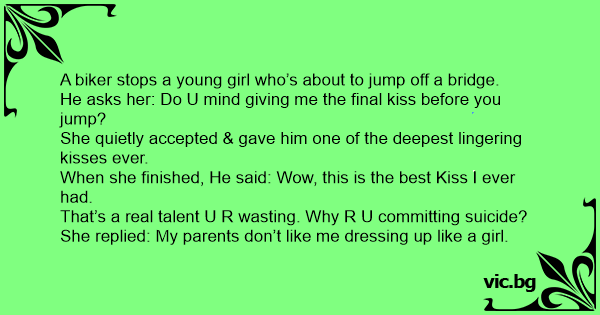He asks her: Do U mind giving me the final kiss before you jump?