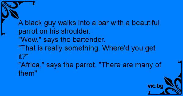 En svart man gick in på en bar med en papegoja på axeln. Han som ägde baren blev mycket imponerad och sa: ”Oj vad snygg, vart har du hittat den.” ”Tack, jag hittade den i Afrika svarade papegojan.”