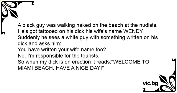 Det var ett europeiskt par som skulle åka på smekmånad till Bahamas. Mannen ville göra tjejen lite glad så han tatuerade han in hennes namn, Wendy, på manslemmen. Dessvärre syntes bara W och Y när...