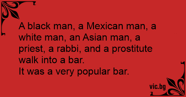 A black man, a Mexican man, a white man, an Asian man, a priest, a rabbi, and a рrоsтiтuте walk into a bar.