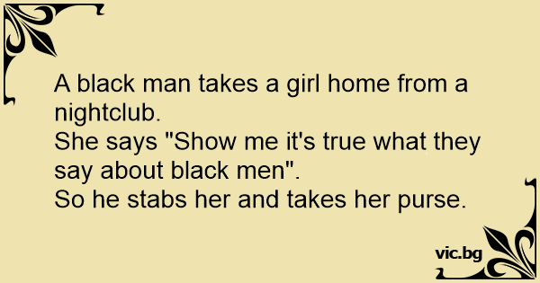 Pigen: vis mig det er rigtigt hvad de siger om sorte mænd.– Så han stak hende ned og stjal hendes taske.