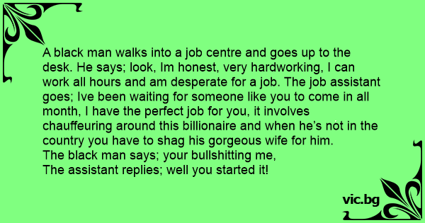 A black man walks into a job centre and goes up to the desk. He says; look, Im honest, very hardworking, I can work all hours and am desperate for a job. The job assistant goes; Ive been waiting for someone like you to come in all month, I have the perfect job for you, it involves chauffeuring around this billionaire and when he’s not in the country you have to shаg his gorgeous wife for him.