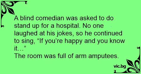 A blind comedian was asked to do stand up for a hospital. No one laughed at his jokes, so he continued to sing, “If you’re happy and you know it…”