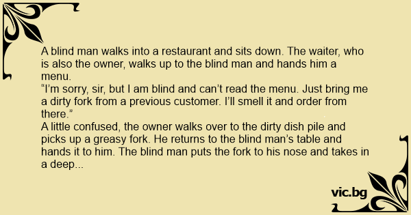 A little confused, the owner walks over to the dirтy dish pile and picks up a greasy fork. He returns to the blind man’s table and hands it to him. The blind man puts the fork to his nose and takes in a deep breath. “Ah, yes, that’s what I’ll have - meatloaf and mashed potatoes.”