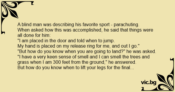A blind man was describing his favorite sport - parachuting.