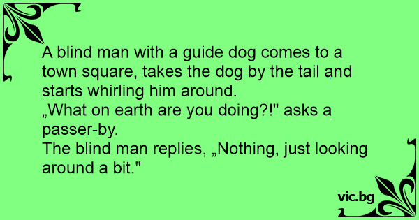 A blind man with a guide dog comes to a town square, takes the dog by the tail and starts whirling him around.