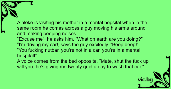 A bloke is visiting his mother in a mental hopsital when in the same room he comes across a guy moving his arms around and making beeping noises.