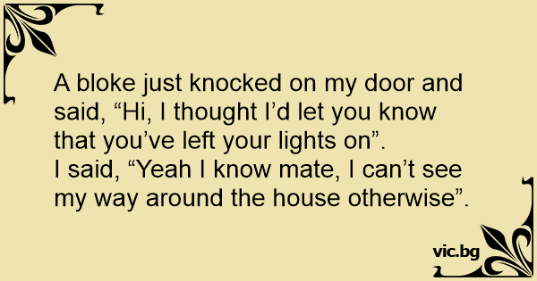 A bloke just knocked on my door and said, “Hi, I thought I’d let you know that you’ve left your lights on”.