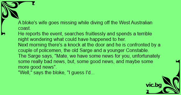 The Sarge says, "I'm really sorry mate, but your wife is dead. Young Bill here found her lying at about five fathoms in a little cleft in the reef. He got a line around her and we pulled her up, but she was dead."