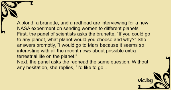 A blond, a brunette, and a redhead are interviewing for a new NASA experiment on sending women to different planets.