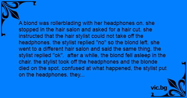 A blond was rollerblading with her headphones on. she stopped in the hair salon and asked for a hair cut. she instructed that the hair stylist could not take off the headphones. the stylist replied "no" so the blond left. she went to a different hair salon and said the same thing. the stylist replied "ok". after a while, the blond fell asleep in the chair. the stylist took off the headphones and the blonde died on the spot. confused at what happened, the stylist put on the headphones. they were saying, "breath in, breath out"