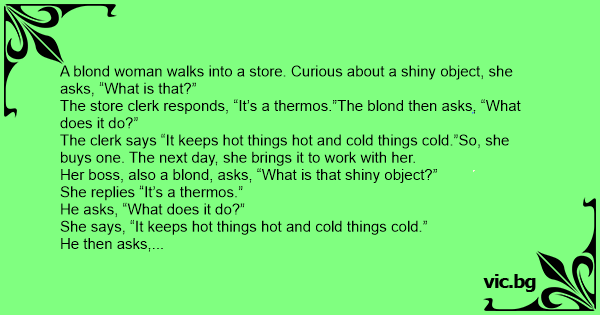 The store clerk responds, “It’s a thermos.”The blond then asks, “What does it do?”