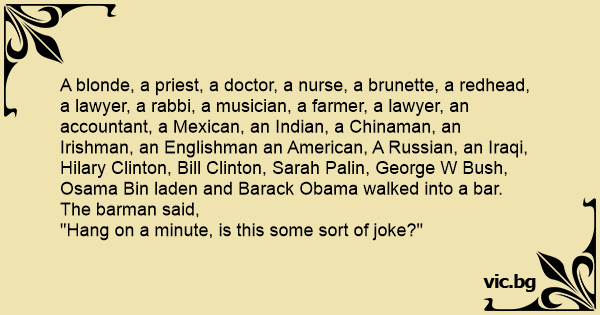 A blonde, a priest, a doctor, a nurse, a brunette, a redhead, a lawyer, a rabbi, a musician, a farmer, a lawyer, an accountant, a Mexican, an Indian, a Chinaman, an Irishman, an Englishman an American, A Russian, an Iraqi, Hilary Clinton, Bill Clinton, Sarah Palin, George W Bush, Osama Bin laden and Barack Obama walked into a bar.