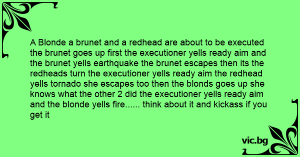 A Blonde a brunet and a redhead are about to be executed the brunet goes up first the executioner yells ready aim and the brunet yells earthquake the brunet escapes then its the redheads turn the executioner yells ready aim the redhead yells tornado she escapes too then the blonds goes up she knows what the other 2 did the executioner yells ready aim and the blonde yells fire...... think about it and kickass if you get it