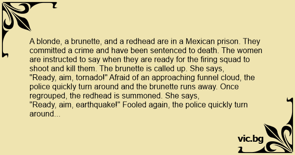 A blonde, a brunette, and a redhead are in a Mexican prison. They committed a сriме and have been sentenced to death. The women are instructed to say when they are ready for the firing squad to shoot and кill them. The brunette is called up. She says,