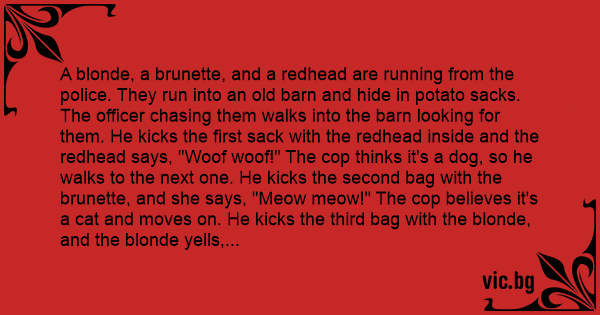 A blonde, a brunette, and a redhead are running from the police. They run into an old barn and hide in potato sacks. The officer chasing them walks into the barn looking for them. He kicks the first sack with the redhead inside and the redhead says, "Woof woof!" The cop thinks it's a dog, so he walks to the next one. He kicks the second bag with the brunette, and she says, "Meow meow!" The cop believes it's a cat and moves on. He kicks the third bag with the blonde, and the blonde yells, "Potato potato!"