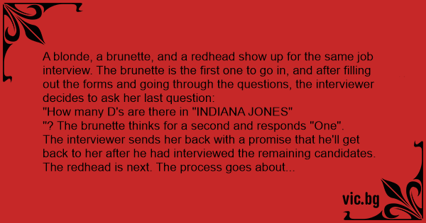 A blonde, a brunette, and a redhead show up for the same job interview. The brunette is the first one to go in, and after filling out the forms and going through the questions, the interviewer decides to ask her last question: