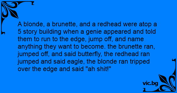 A blonde, a brunette, and a redhead were atop a 5 story building when a genie appeared and told them to run to the edge, jump off, and name anything they want to become. the brunette ran, jumped off, and said butterfly, the redhead ran jumped and said eagle, the blonde ran tripped over the edge and said "ah shiт!"