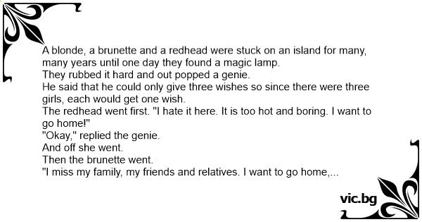A blonde, a redhead, and a brunette were all lost in the desert. They found a lamp and rubbed it. A genie popped out and granted them each one wish.