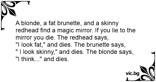 A blonde, a fат brunette, and a skinny redhead find a magic mirror. If you lie to the mirror you die. The redhead says,
