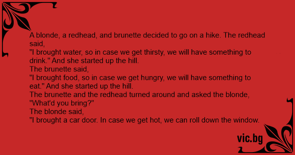 A blonde, a redhead, and brunette decided to go on a hike. The redhead said,