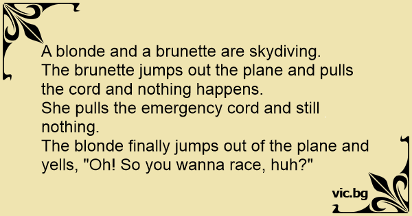The blonde finally jumps out of the plane and yells, "Oh! So you wanna race, huh?"