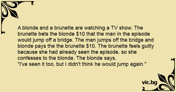 A blonde and a brunette are watching a TV show. The brunette bets the blonde $10 that the man in the episode would jump off a bridge. The man jumps off the bridge and blonde pays the the brunette $10. The brunette feels guilty because she had already seen the episode, so she confesses to the blonde. The blonde says,