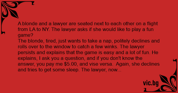 Een blondje en een advocaat zitten in het vliegtuig. Het blondje is moe en wil wat slapen, maar de advocaat stelt haar voor een spelletje te spelen. Het blondje weigert en draait zich om om wat te...