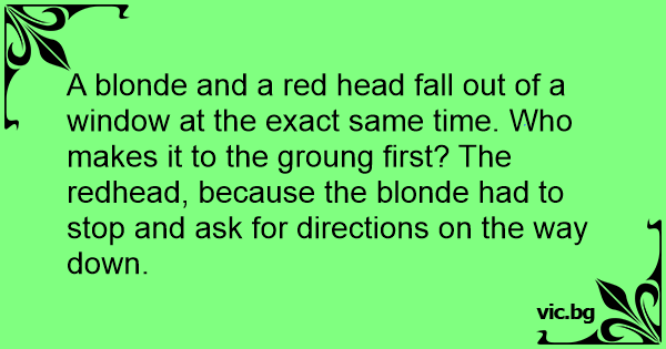 A blonde and a red head fall out of a window at the exact same time. Who makes it to the groung first? The redhead, because the blonde had to stop and ask for directions on the way down.