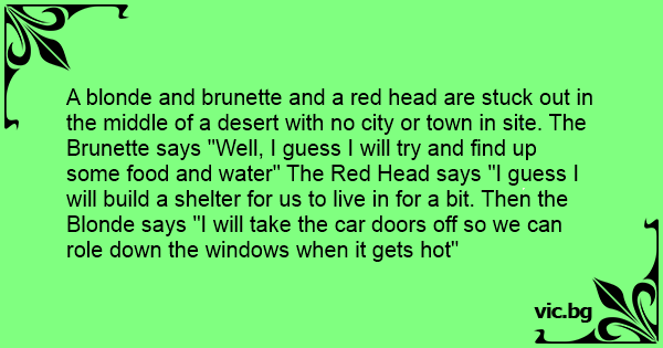 A blonde and brunette and a red head are stuck out in the middle of a desert with no city or town in site. The Brunette says "Well, I guess I will try and find up some food and water" The Red Head says "I guess I will build a shelter for us to live in for a bit. Then the Blonde says "I will take the car doors off so we can role down the windows when it gets hot"
