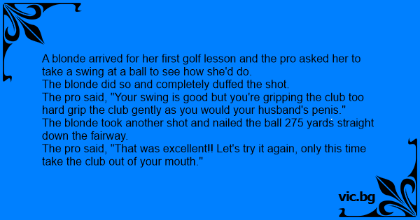 Det var en gång ett gift par som skulle ut och golfa. Mannen var duktig på golf men inte hustrun. Guiden skulle hjälpa henne med att slå golfbollen. Alla slag hon slog var värdelösa. Då sa guiden. -Låtsas att golfklubban är din mans penis. Hustrun svarade. -Ok. Hon slog och den flög långt. -Bra,...