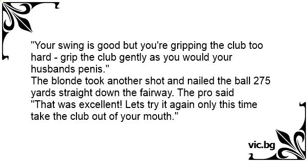 A blonde arrived for her first golf lesson and the pro asked her to take a swing at a ball to see how she'd do. The blonde did so and completely duffed the shot. The pro said, "Your swing is good but you're gripping the club too hard grip the club gently as you would your husband's penis." The...