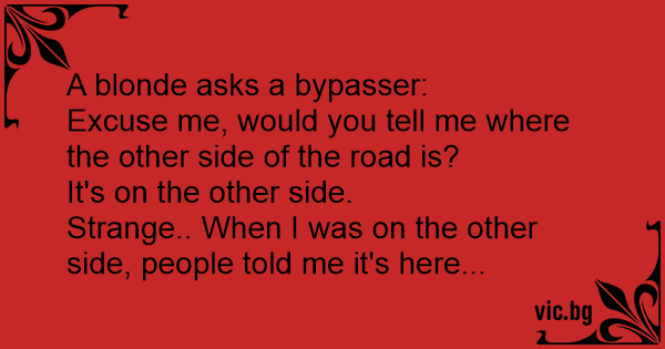 Er staan twee domme blondjes elk aan een andere kant van de weg. Het ene blondje vraagt hoe kom ik aan de andere kant van de weg? Dommie zegt het andere blondje je staat toch al aan de andere kant!