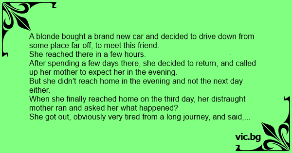 A blonde bought a brand new car and decided to drive down from some place far off, to meet this friend.