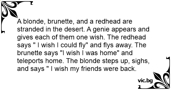 A blonde, brunette, and a redhead are stranded in the desert. A genie appears and gives each of them one wish. The redhead says " I wish I could fly" and flys away. The brunette says "I wish I was home" and teleports home. The blonde steps up, sighs, and says " I wish my friends were back.