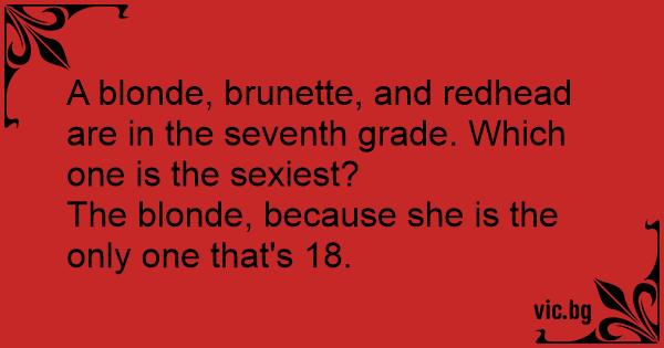Q: A brunette, a blonde and a redhead are all in fifth grade. Who has the biggest tits? A: The blonde, because she's 18.
