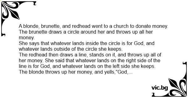 A blonde, brunette, and redhead went to a church to donate money. The brunette draws a circle around her and throws up all her money.