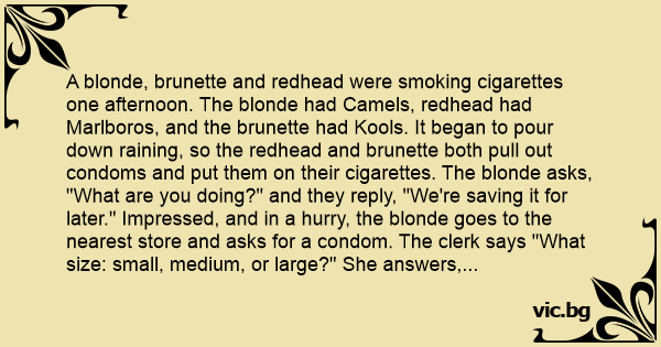 A blonde, brunette and redhead were smoking cigarettes one afternoon. The blonde had Camels, redhead had Marlboros, and the brunette had Kools. It began to pour down raining, so the redhead and brunette both pull out condoms and put them on their cigarettes. The blonde asks, "What are you doing?" and they reply, "We're saving it for later." Impressed, and in a hurry, the blonde goes to the nearest store and asks for a соndом. The clerk says "What size: small, medium, or large?" She answers, "I don't know, one to fit a camel?"