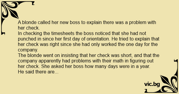 The blonde went on insisting that her check was short, and that the company apparently had problems with their math in figuring out her check. She asked her boss how many days were in a year.