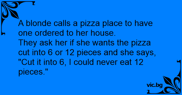 Blondýnka si objednala pizzu. Číšník se ptá: „Chcete ji rozřezat na šest, nebo na dvanáct kousků?” „Na šest,” odpoví rychle zákaznice. „Dvanáct bych jich nikdy nesnědla!”