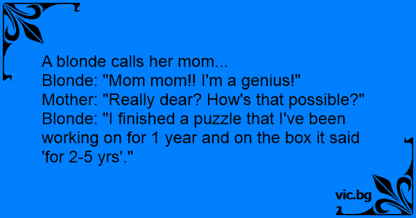 - Vet du varför blondinen var så stolt när hon lagt färdigt pusslet? - Nej. - För det tog henne bara en månad att bygga färdigt det, på kartongen stod det 1 till 2 år.