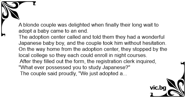 The couple said proudly, "We just adopted a Japanese baby and in a year or so he'll start to talk. We just want to be able to understand him".